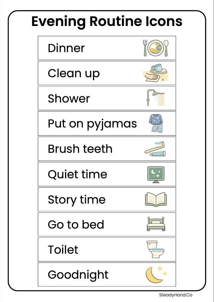 A printable icons pack for building flexible evening and bedtime schedules, adapting routines, or creating custom visual supports.